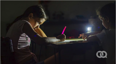 Niñas en edad escolar haciendo sus deberes a la luz de un celular. Fuente: elToque (2025).