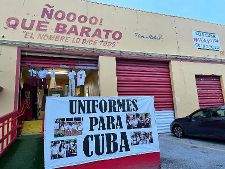 Cartel promocional de venta de uniformes cubanos de la tienda Ñooo que barato, en Miami. Fuente: Cubanet (2021).