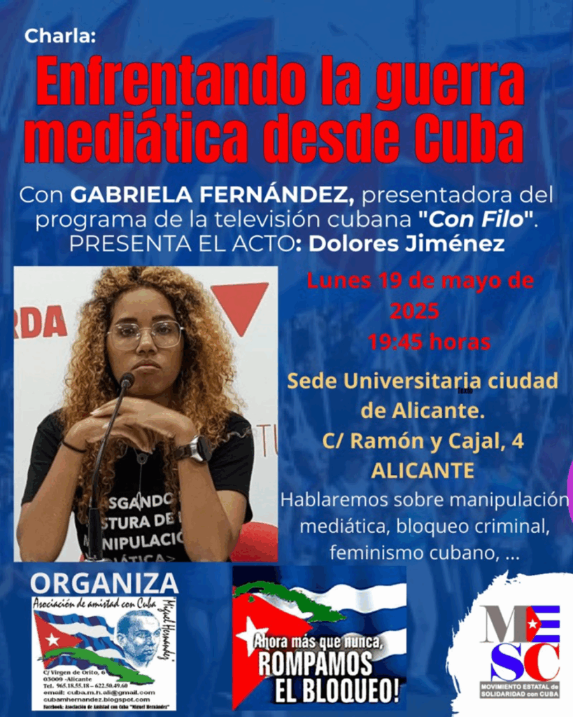 El encuentro que sostuvo en Alcoy, titulado “La mujer cubana en la lucha antimperialista”, apenas presentó variaciones discursivas. Volvió a referir cómo Estados Unidos “amenaza” a la Revolución cubana con el “bloqueo económico” e intenta “asfixiar” energéticamente a la Isla, atentando contra el desarrollo del socialismo, el sistema de “democracia participativa y popular”, y los objetivos de soberanía energética.