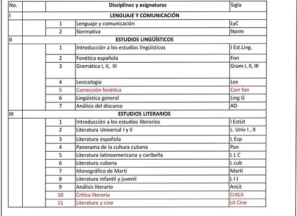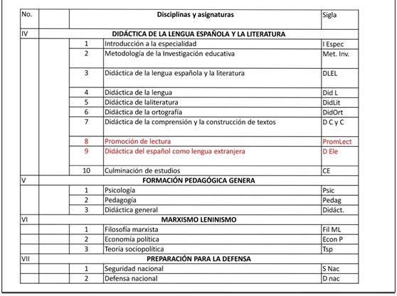 Así, el estudiantado que opte por esta opción formativa deberá superar las disciplinas Lenguaje y comunicación, Estudios literarios, Estudios lingüísticos, Didáctica de la lengua española y la literatura (como Disciplina principal integradora), Formación pedagógica general, Marxismo-Leninismo, Historia de Cuba y Preparación para la defensa.