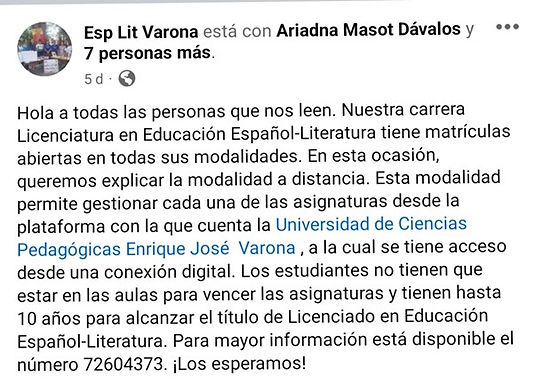 “Esta modalidad permite gestionar cada una de las asignaturas desde la plataforma con la que cuenta la Universidad de Ciencias Pedagógicas Enrique José Varona, a la cual se tiene acceso desde una conexión digital. Los estudiantes no tienen que estar en las aulas para vencer las asignaturas y tienen hasta 10 años para alcanzar el título de Licenciado en Educación Español-Literatura”, anuncia la página de Facebook de la especialidad.