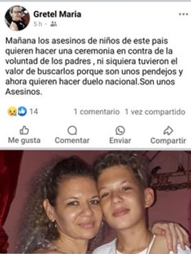 “Mañana los asesinos de niños de este país quieren hacer una ceremonia en contra de la voluntad de los padres, ni siquiera tuvieron el valor de buscarlos porque son unos pendejos y ahora quieren hacer duelo nacional. Son unos Asesinos”, escribió en su perfil de Facebook.