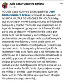 Julio César Guerrero Batista, padre del recluta José Carlos Guerrero Gracia, desmintió la existencia de labores de rescate en el terreno, además de criticar la falta de empatía de las máximas autoridades de las FAR y el PCC, quienes no se reunieron con los familiares para darles razón de los desaparecidos. (Foto tomada de Facebook)