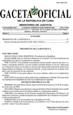 Mediante el Decreto Presidencial 956/2025, Miguel Díaz-Canel Bermúdez estipula que entre las 6:00 am y las 12:00 de la noche de este 20 de enero, la bandera deberá izarse a media asta “como justo tributo a los trece militares caídos en el cumplimiento del deber”.