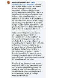 El Doctor en Ciencias Jurídicas René Fidel González García explicó como, de materializarse, el Código de la Niñez se articularía con disposiciones recientemente adoptadas. Esto, completaría el panorama de represión estatal que impera en la Isla. (Captura de pantalla del comentario de René Fidel González García en la publicación de Zea Giselle)