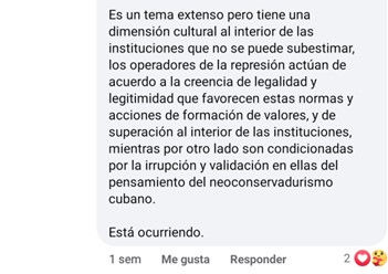 “(...) los operadores de la represión actúan de acuerdo a la creencia de legalidad y legitimidad que favorecen estas normas y acciones de formación de valores, y de superación al interior de las instituciones, mientras por otro lado son condicionadas por la irrupción y validación en ellas del pensamiento del neoconservadurismo cubano. Está ocurriendo”, sentenció.
