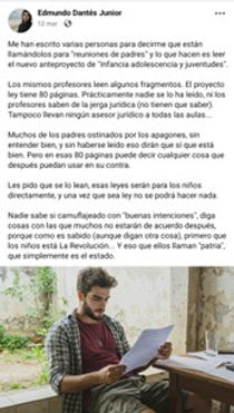 "Muchos de los padres ostinados por los apagones, sin entender bien, y sin haberse leído eso dirán que sí que está bien. Pero en esas 80 páginas puede decir cualquier cosa que después puedan usar en su contra (...) Nadie sabe si camuflajeado con "buenas intenciones", diga cosas con las que muchos no estarán de acuerdo después, porque como es sabido (aunque digan otra cosa), primero que los niños está La Revolución... Y eso que ellos llaman "patria", que simplemente es el estado", finalizó, no sin antes enfatizar la necesidad de leer y entender completamente el texto.