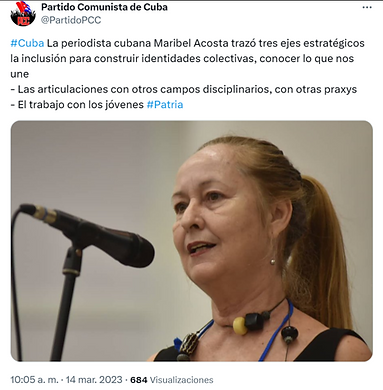 La DraC. Maribel Acosta Damas, periodista y profesora de la Facultad de Comunicación (FCOM), de la Universidad de La Habana (UH), participará en una charla en España junto a Gabriela Fernández Álvarez, presentadora del programa “Con Filo” de la televisión estatal cubana, como parte de una gira por varias ciudades españolas para divulgar la narrativa oficial del Partido Comunista de Cuba (PCC).
