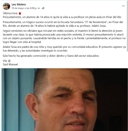 El Observatorio de Libertad Académica (OLA) conoció esta semana de la muerte de Adalvi Sosa, un trabajador de la Escuela Secundaria Básica “27 de noviembre”, ubicada en el poblado costero Puerto Esperanza, perteneciente al municipio Viñales, de la provincia Pinar del Río.