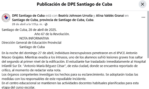 La Dirección Provincial de Educación de Santiago de Cuba, confirmó que en la noche del domingo 27 de abril, “individuos inescrupulosos penetraron en el IPVCE Antonio Maceo”. Como resultado del incidente, “mientras evadía a los intrusos” un estudiante sufrió “lesiones graves”.