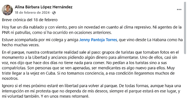 La historiadora y ensayista, Alina Bárbara López Hernández, exprofesora de la Universidad de Matanzas, y quien fue expulsada de la oficialista Unión de Escritores y Artistas de Cuba (Uneac), como consecuencia de su activismo cívico y sus posturas críticas hacia el Gobierno cubano, realiza una protesta el día 18 de cada mes en el Parque de la Libertad de la ciudad de Matanzas.