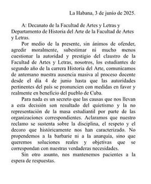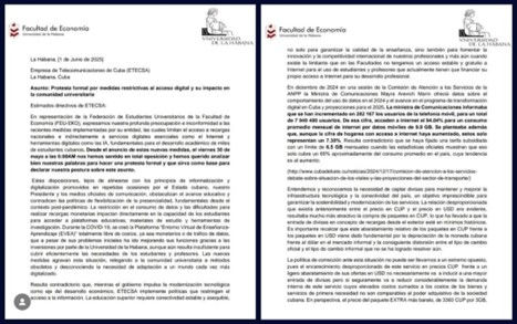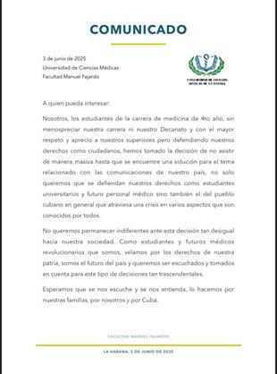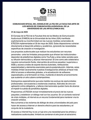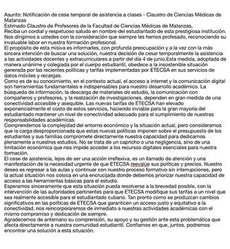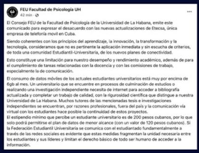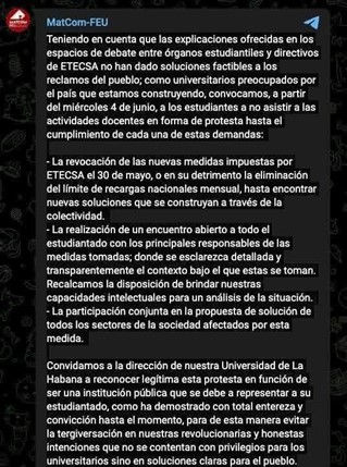 «Ante la inactividad de los dirigentes de la FEU de nuestra institución y por temor a futuras consecuencias, un grupo de estudiantes (que no somos pocos) de la Universidad de Ciencias Médicas de Cienfuegos “Raúl Dorticós Torrado”, elegimos esta vía para manifestar nuestro rechazo ante las medidas implementadas recientemente por la Empresa de Telecomunicaciones de Cuba S. A. (Etecsa). Consideramos que las nuevas tarifas no solo constituyen una afrenta al estudiantado y a la totalidad del pueblo cubano, sino una violación directa de derechos constitucionales consignados en la carta magna de la República, como son el derecho a la educación y el derecho a la información (...)».